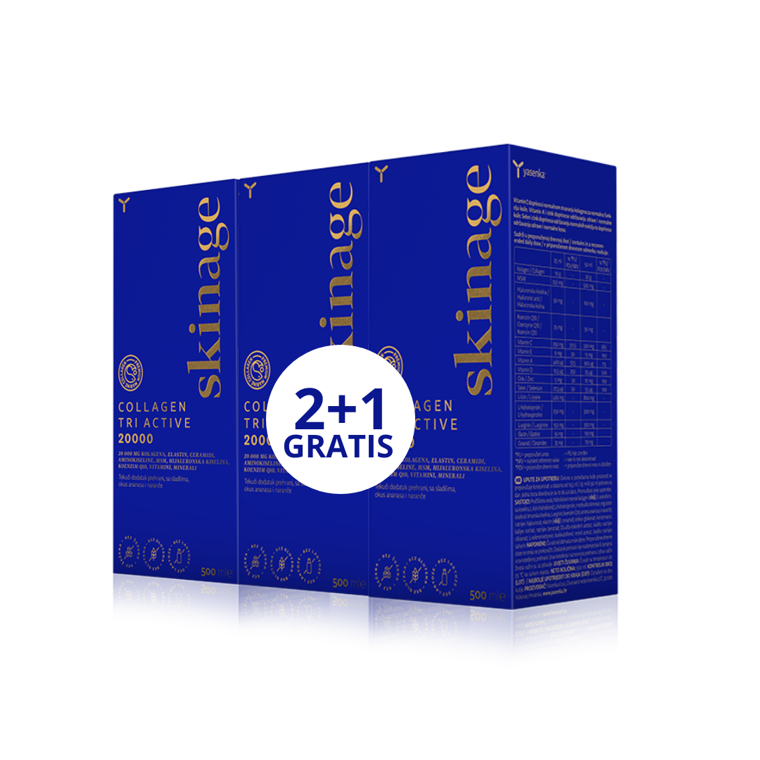 Dodaci prehrani na bazi kolagena, Kolagen Tri Active, i tri razine djelovanja: Ceramidi, Aminokiseline, Kolagen i Elastin.